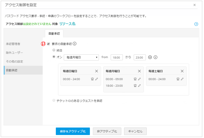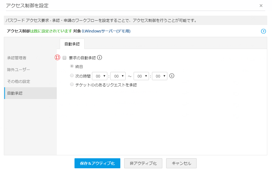 | ⑬ | 要求の自動承認 | 申請後、設定した条件の場合自動的に承認します。