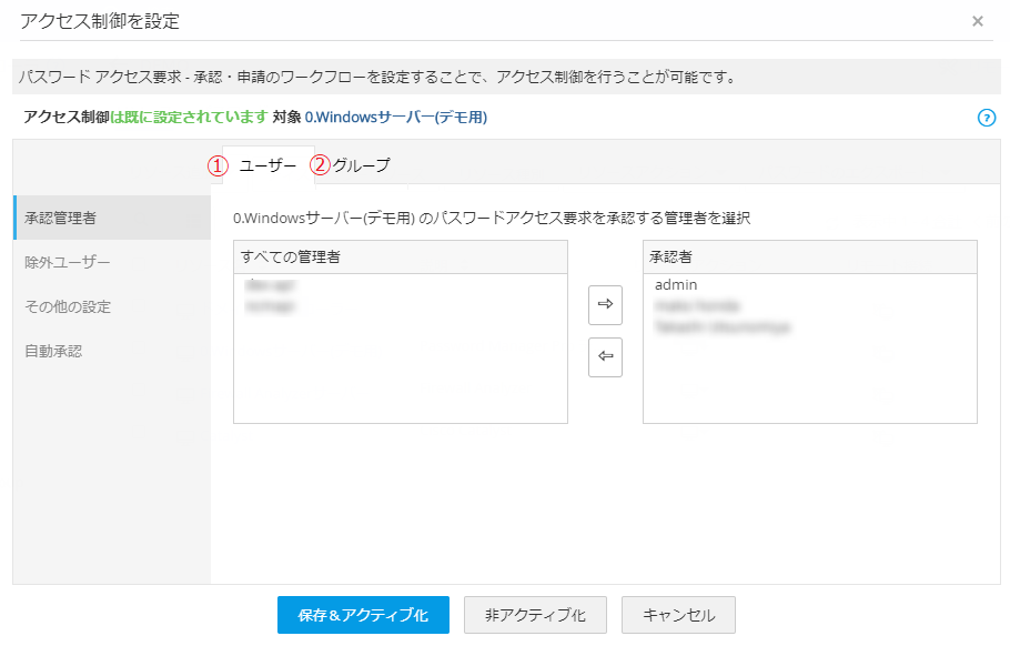 | ② | 承認者グループの設定 | ユーザーアカウントへの承認要求があった場合の承認可能なユーザーグループを設定します。承認者の権限は、管理者またはパスワード管理者である必要があります。 |
