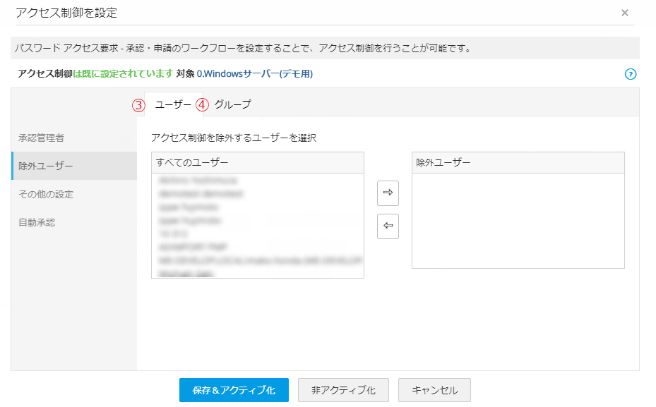 | ③ | 除外ユーザーの設定 | 承認を必要としないPMPユーザーを指定します。 |