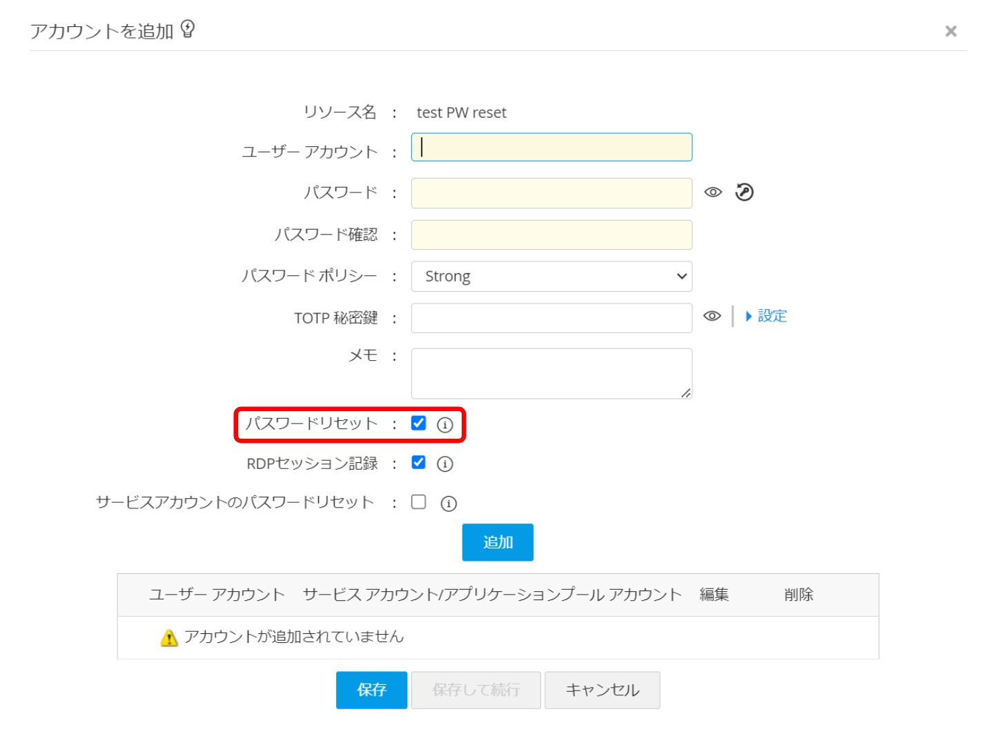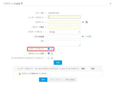 アカウントを手動で追加する際、「アカウントを追加」画面において、「パスワードリセット」のチェックボックスを外して「保存」をクリックしても設定の変更が反映されず、パスワードリセットを無効化できない。