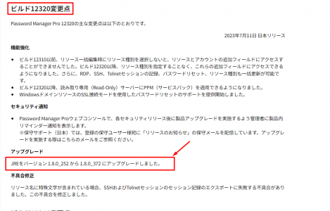Password Manager Proでは、ビルド12320において、製品にバンドルされたJREのバージョンをアップグレードしました。