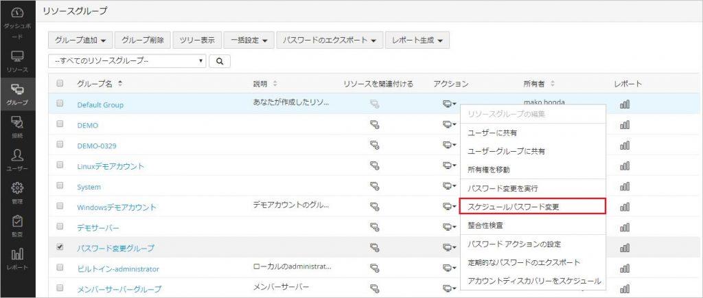 [グループ]画面からパスワードの一括変更を実施するリソースグループを選択後、[アクション]->[スケジュールパスワード変更]より一括変更設定を行うことが可能です。