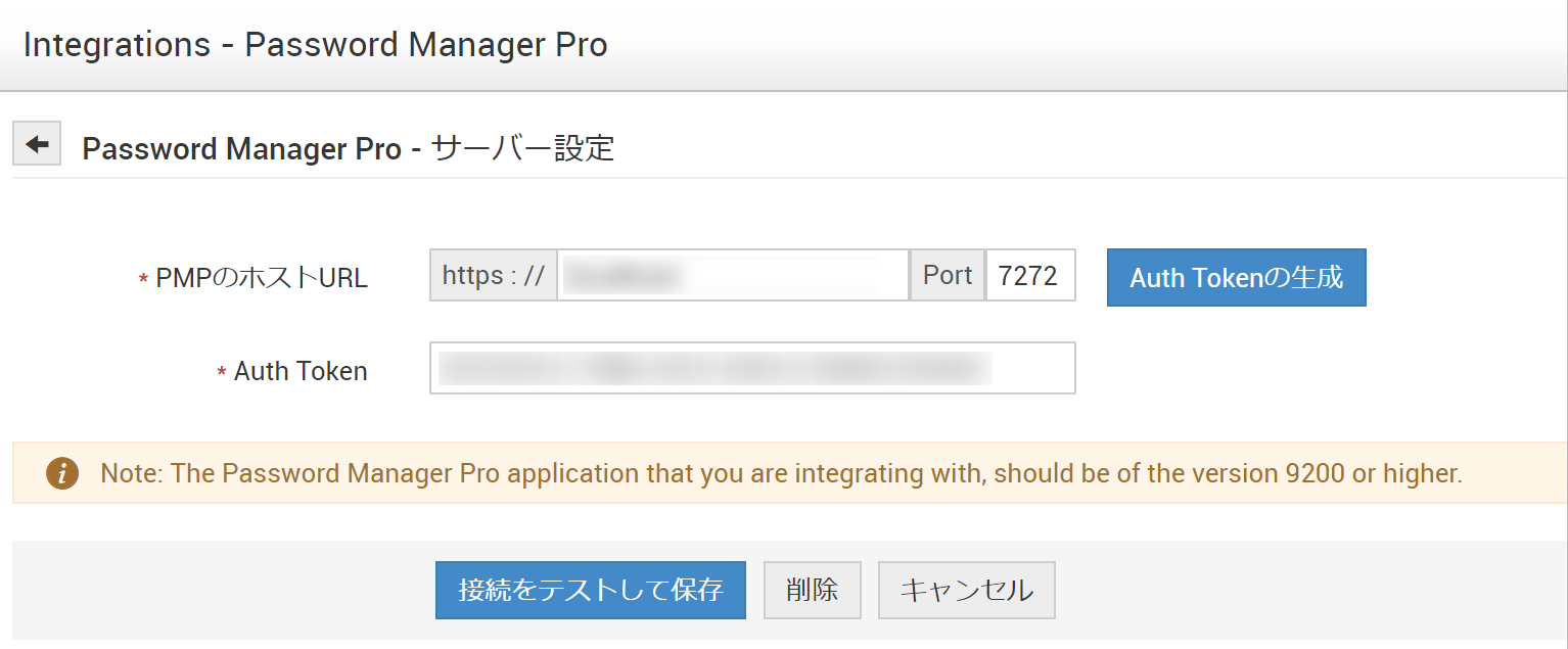 - [削除]をクリックして、PMPサーバー情報と手順3で取得したAuth Tokenを入力して[接続をテストして保存]をクリックします。