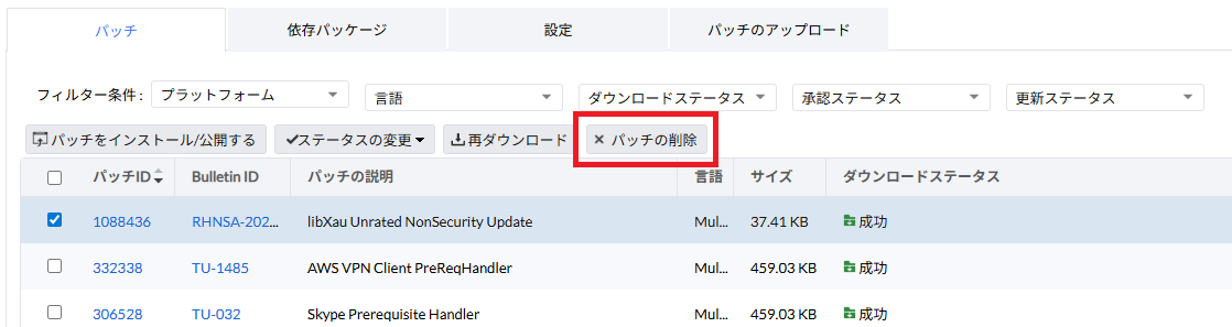 - 削除したいパッチを選択し[パッチの削除]をクリックします。