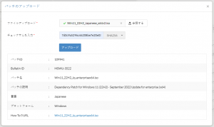 (実際のファイル名やハッシュ値、選択するパッチは上記の画像とは異なる場合があります。適切な値を選択/入力してください)。 - 複数の言語のOSに対して機能更新プログラムを配布する場合、各言語のisoファイルをそれぞれダウンロードし、同様の手順を実行してアップロードします。