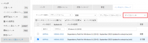 - フィルター条件に並んでいる4つのプルダウンのうち一番右側のプルダウンをクリックして「すべてのパッチ」を選択します(「ネットワーク内で欠落パッチ」を選択した状態でも目的のパッチが表示されている場合は、この手順を飛ばします)。