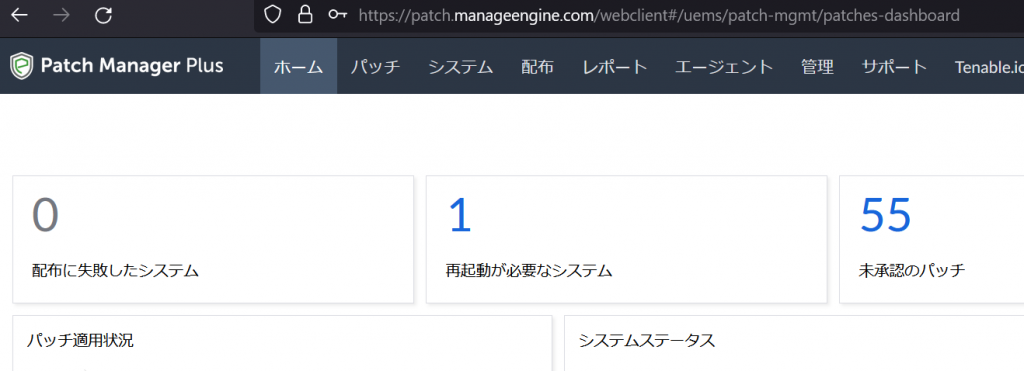 (「パッチ」タブ > 適用可能なパッチ の「欠落システム」欄が1以上の数字、