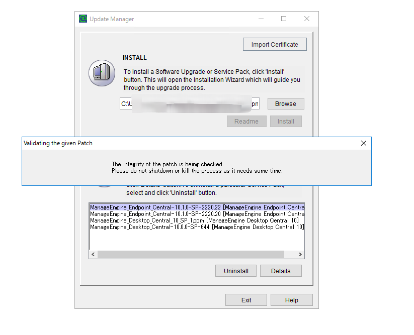 (デフォルトのパスは初回インストール時のビルドによって異なります) - [Browse]をクリック後、[ManageEngine_Patch_Manager_Plus_11_SP_2.ppm]を選択します。
