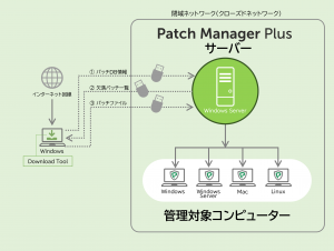 Patch Manager Plusサーバーは通常インターネットに接続する必要がありますが、インターネットに接続しない閉域ネットワークでのパッチ管理にも対応できます。