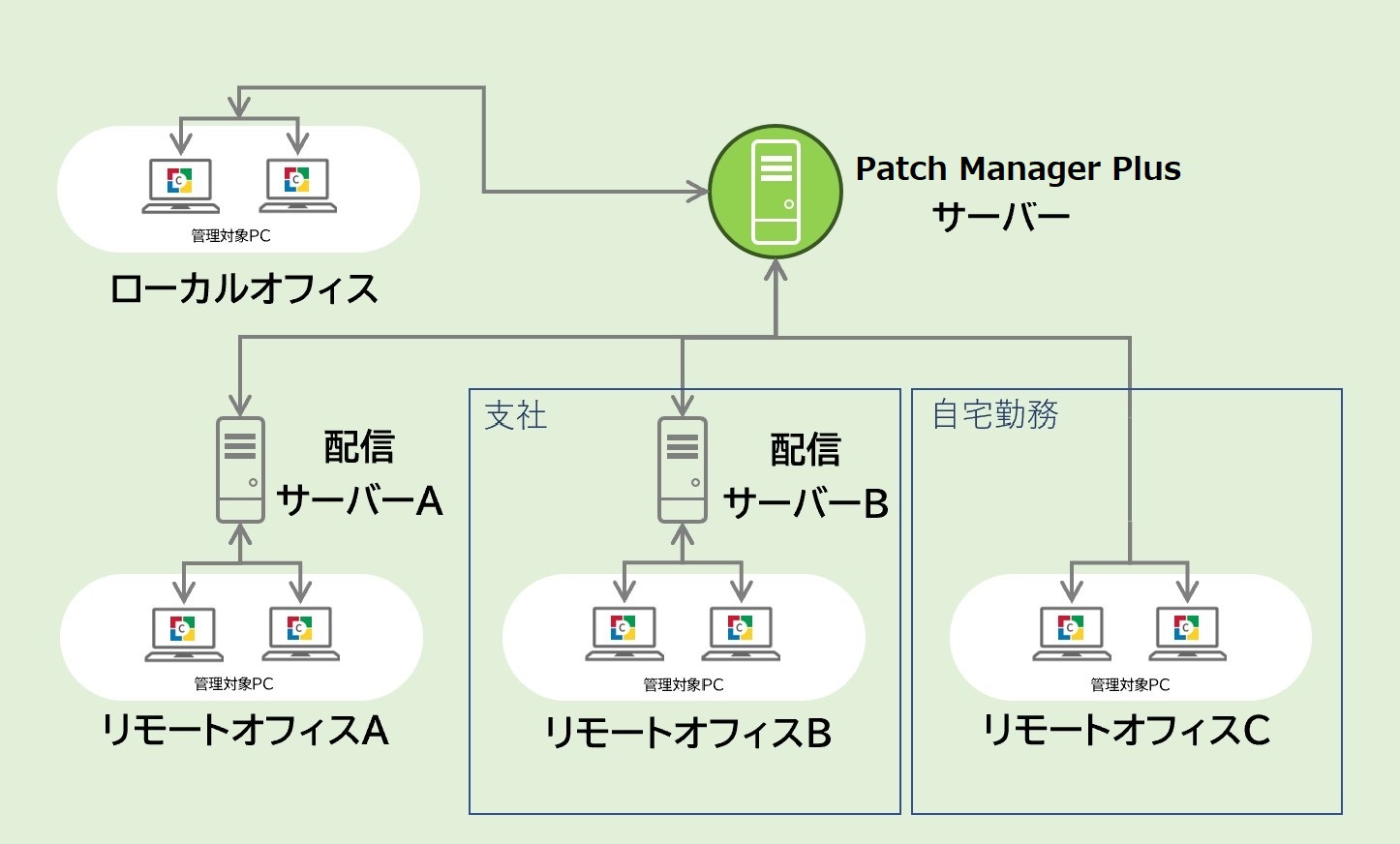 Patch Manager Plusでは、1つのコンピューターは1つのリモートオフィスまたはローカルオフィスのみに所属します。
