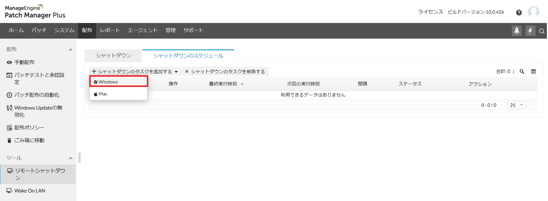 - [配布]タブ > リモートシャットダウン > [シャットダウンのスケジュール]小タブ > [シャットダウンタスクを追加する] > Windows をクリック