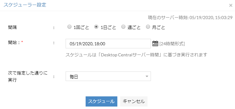 - スケジューラーの設定にて、操作を実施するタイミングや頻度を指定する