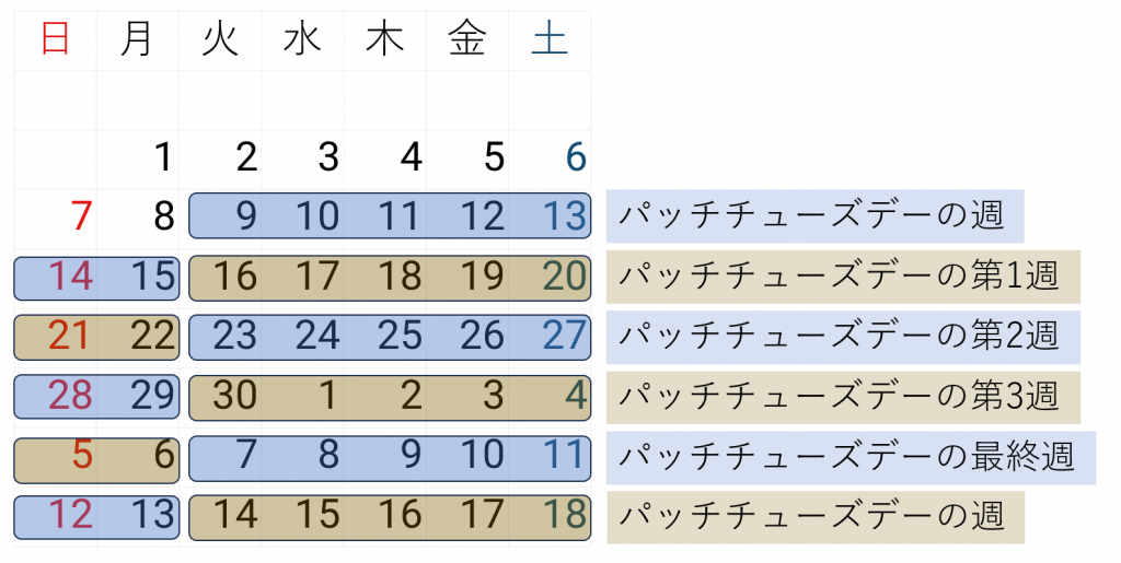 「火曜日が5回存在する月の第2火曜日から、その翌月の第2火曜日の前日まで」という期間の中においては、「パッチチューズデーの第3週」の次の週が「パッチチューズデーの最終週」である。