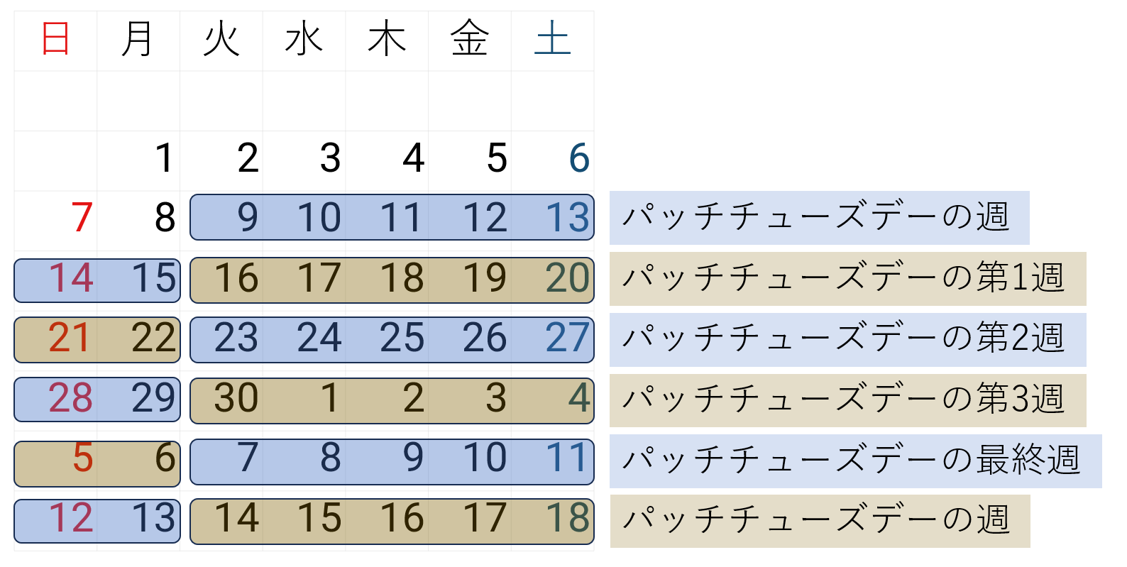 「火曜日が4回のみ存在する月の第2火曜日から、その翌月の第2火曜日の前日まで」という期間の中においては、「パッチチューズデーの第2週」( = 第4火曜日から始まる7日間)の次の週が、「パッチチューズデーの最終週」である。