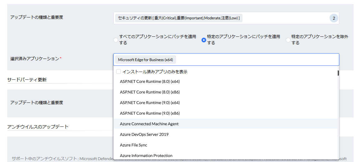 なお、当製品が対応するアンチウイルスソフトは限定的です。各アンチウイルスソフトの詳細な仕様が公開されないため、対応するアンチウイルスソフトが追加される可能性は高くありません。 - 上記で選択した種類のパッチのうち、特定のソフトウェアのパッチのみを配布したい場合、「特定のアプリケーションにパッチを適用する」を選択します。「特定のアプリケーションを除外する」を選択することで、特定のソフトウェア以外のパッチを配布することも可能です。