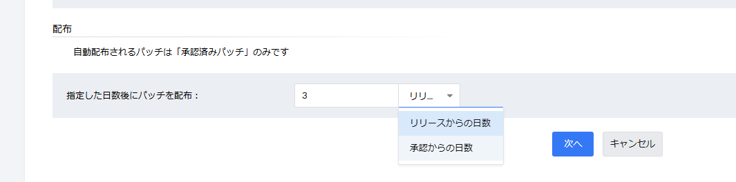 - 承認からの日数を選択した場合:パッチの承認ステータスが「承認済み」に設定されてからの日数を指定します。
