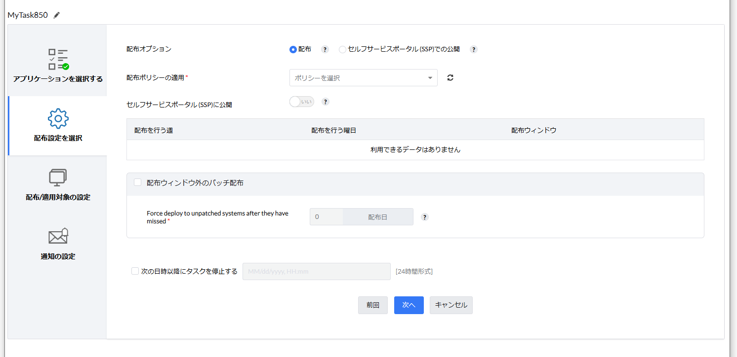 - 「配布オプション」で、「配布」と「セルフサービスポータル(SSP)での公開」のいずれかを選択します。