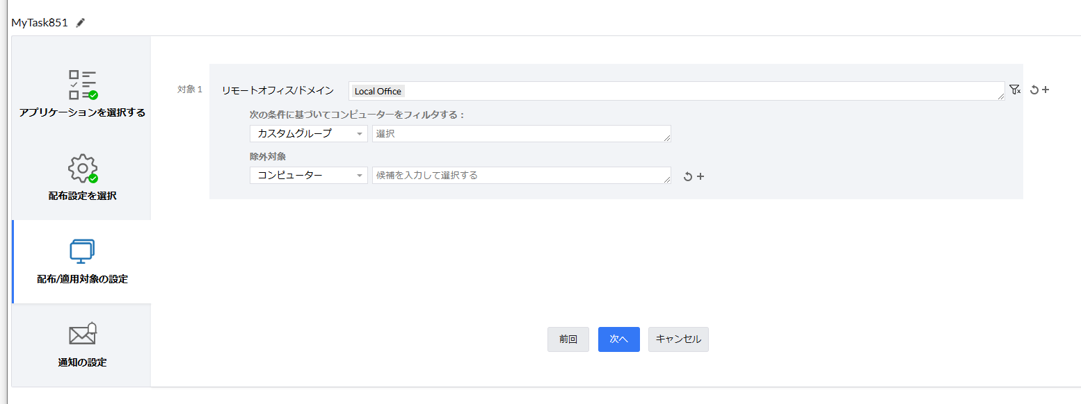 パッチ配布を行う対象の端末を指定します。リモートオフィス/ドメイン単位で選択後、IPアドレスの範囲やカスタムグループなどの条件で絞り込むことができます。 - 通知の設定