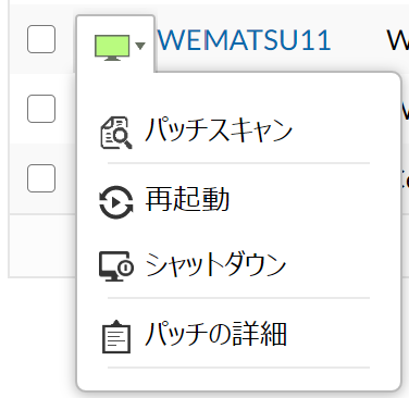 - エージェントタブ > PC や、システムタブ > 管理中のシステム などのPC一覧画面において、緑色のコンピューターアイコンをクリックすると、各種操作が実行できます。