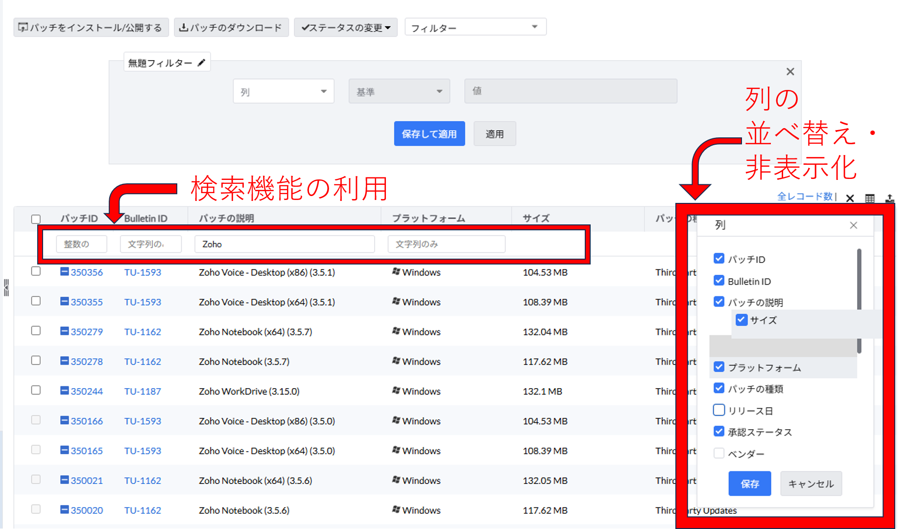 - 上述の[パッチ]タブの場合と同様、不要な列を非表示化したり、一部の列について検索を行ったりすることのほか、フィルターを設定することで、表示内容を絞り込むことができます。