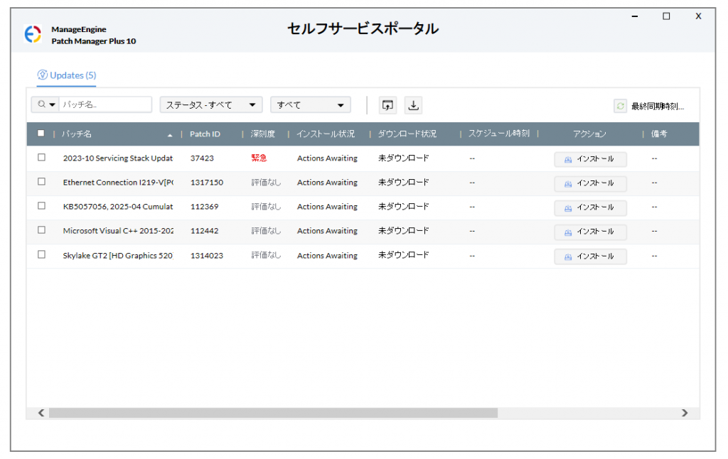 - エンドユーザーは、許可されたパッチを一覧で確認できます。一覧の中から、インストールしたいパッチを選択してインストールします。