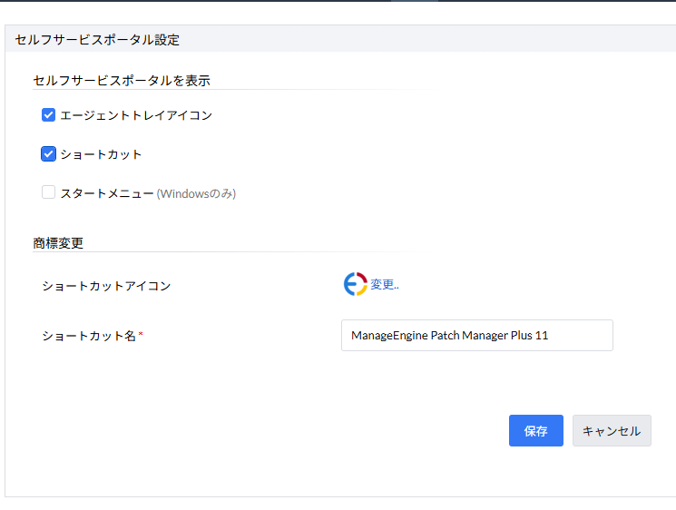 Windows, Mac の通知領域にエージェントトレイアイコンを表示している場合、アイコンを右クリックするとメニューが表示されます。アイコンのメニューに「セルフサービスポータル」を追加します。 - ショートカット: