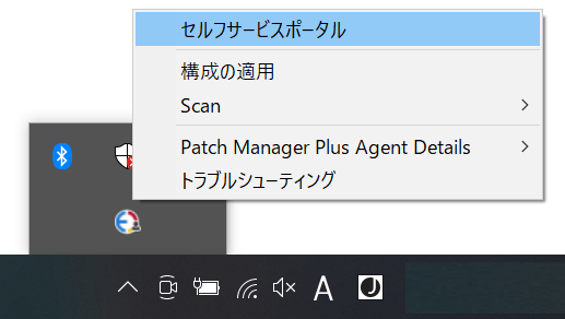- デスクトップ画面右下の通知領域にあるエージェントアイコンを右クリックし、「セルフサービスポータル」を選択します。