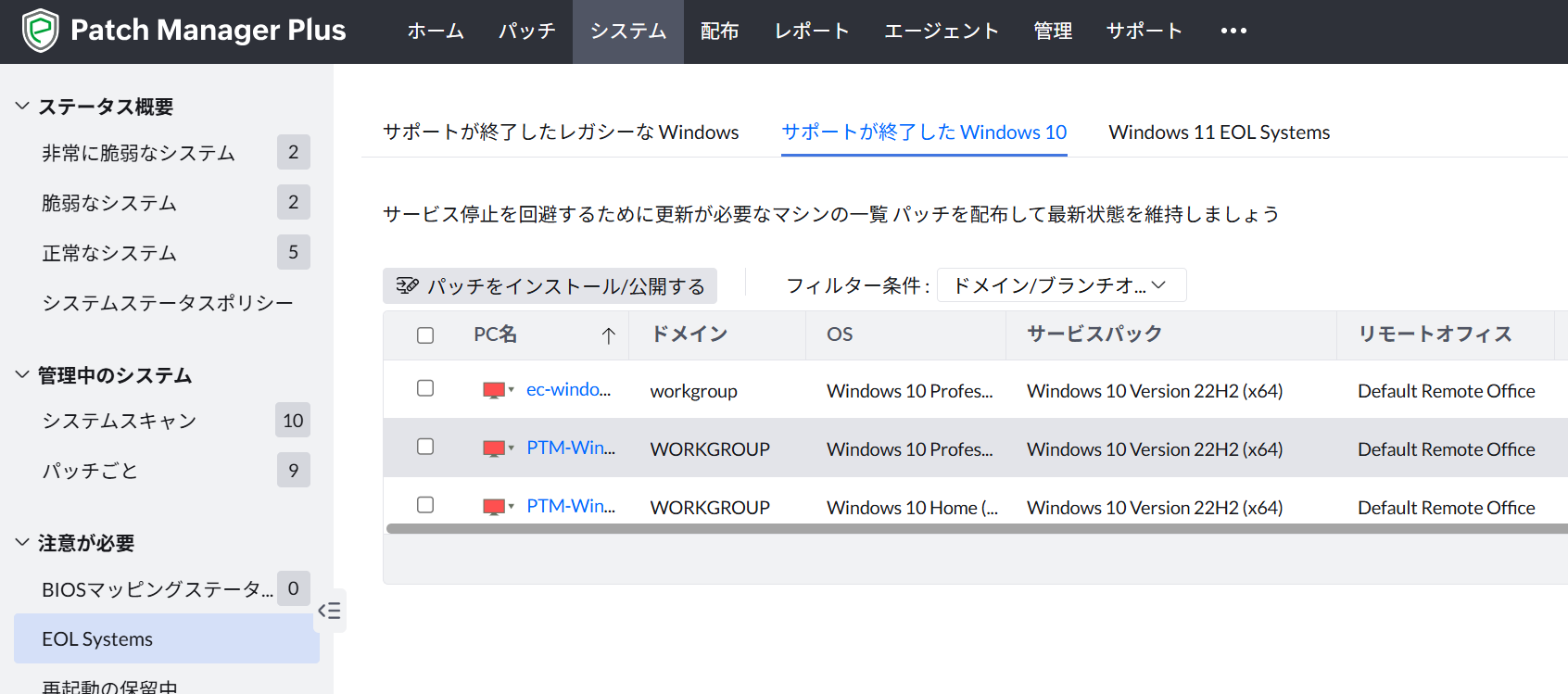 - コンソール画面の[システム]タブ →「注意が必要」→[EOL Systems]を開きます。