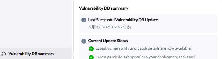 - パッチDB同期について、ステータス画面の追加を行いました。「パッチ」タブ→左メニューの一番下の「Vulnerability DB Summary」をクリックすると確認できます。