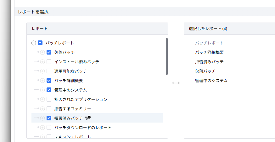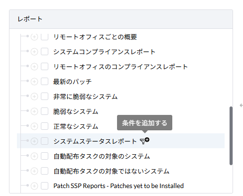 - 「レポートを選択」の項目で、「パッチレポート」の左横の「+」ボタンをクリックします。