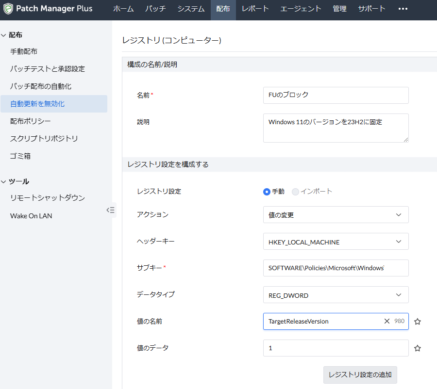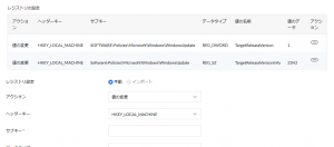 そのため、Windows Updateで機能更新プログラムを配布する場合は、必要に応じてこの値を適宜変更する必要があります。ただし、指定したバージョンのサポート期限を過ぎると、この設定は機能しなくなるとされています(参考:Microsoft)。 - 続いて以下の内容を入力し、完了後[レジストリ構成の追加]をクリックします。