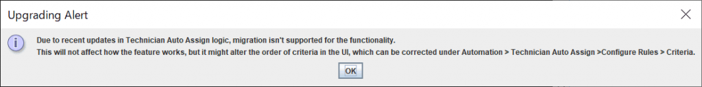 こちらのアラートは、技術担当者の自動割り当てに関する一部設定が、アップグレード後に保持されない可能性があることを示しています。具体的には、技術担当者の自動割り当てに関するプログラムのアップデートにより、UI上での技術担当者の自動割り当てに関する「基準」の順序が保持されない可能性がございます。
