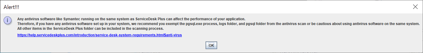 そのため、システムにアンチウイルスソフトウェアを設定している場合、ServiceDesk Plusのインストールフォルダー全体をウイルススキャンの対象から除外することを推奨しています。