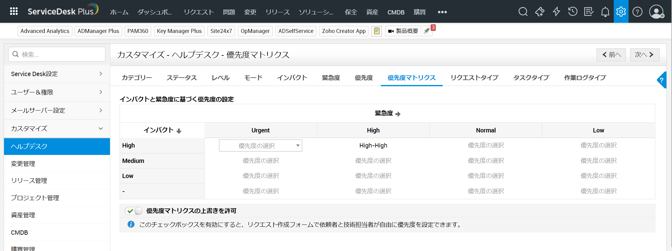 優先度マトリクスの設定画面には、「優先度マトリクスの上書きを許可」オプションが実装されています。