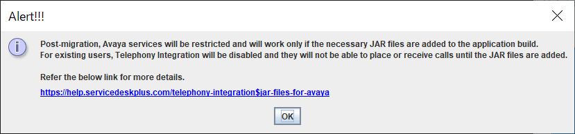 こちらのアラートは、アップグレード後にAvayaサービスが制限され、ServiceDesk PlusにJARファイルを追加しない限りサービスが動作しなくなる旨を示しています。