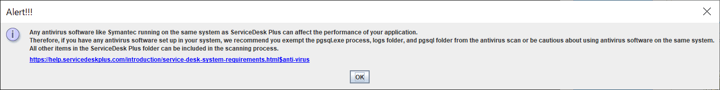 こちらのアラートは、ServiceDesk Plusが起動しているシステム内のSymantecなどのアンチウイルスソフトウェアが、