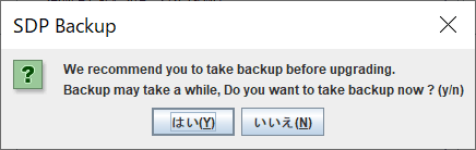 「はい」を選択すると、バックアップの取得が開始され、完了後にアップグレード処理が続行します。