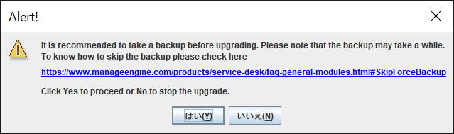 こちらアラートは、アップグレード前にバックアップの取得を推奨する旨を示しています。