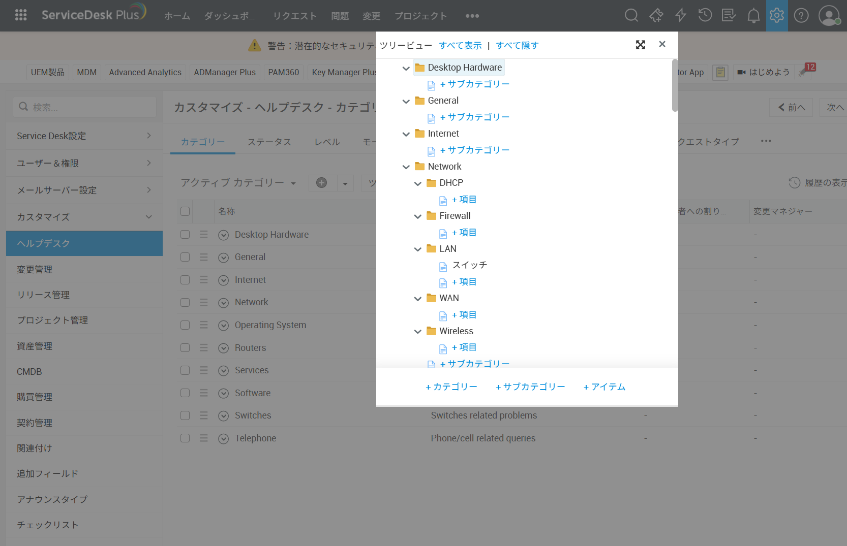 - [管理]→[カスタマイズ]→[ヘルプデスク]→[カテゴリー]をクリックします。