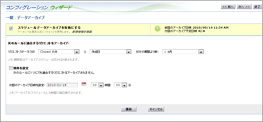 ・次回のアーカイブ日時を設定で、アーカイブの開始日時を設定してください。 スケジュールした時間間隔に基づき、アーカイブ処理が実行されます。 データアーカイブタスクは、1日に5時間実行され、 5時間以内に可能な限り多くのリクエストをアーカイブします。 残ったリクエストに関しては、翌日等にアーカイブされます。
