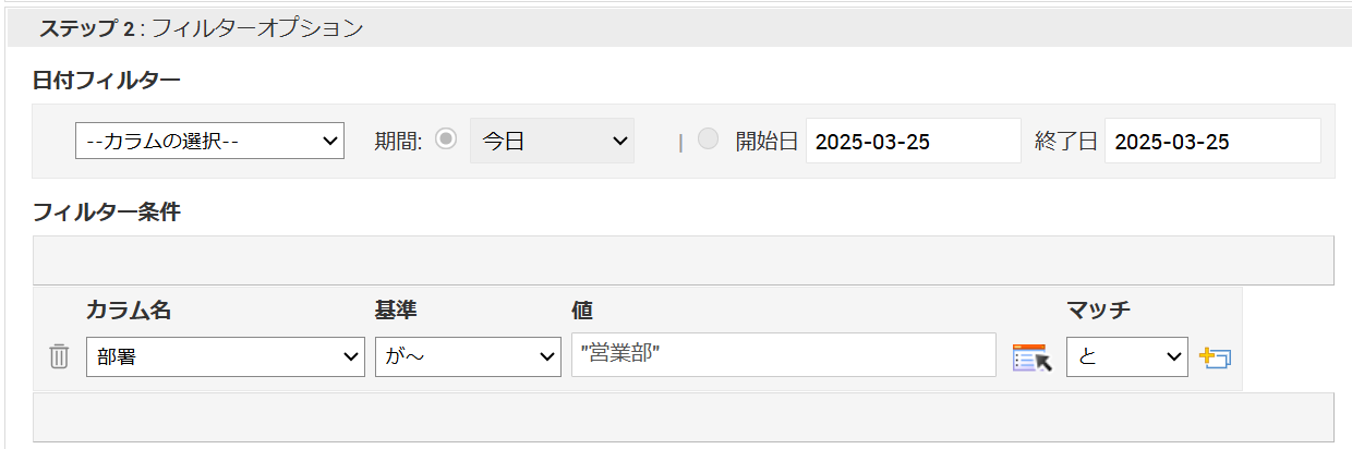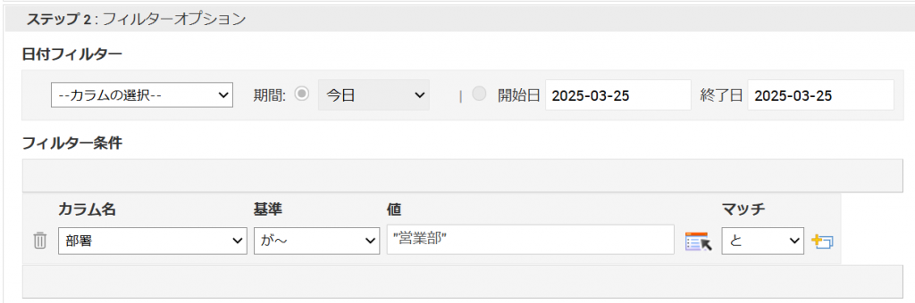 - 「ステップ2:フィルターオプション」の「フィルター条件」の「カラムの選択」で「部署」、「基準の選択」で「が~」を選択し、特定の部署を指定します。