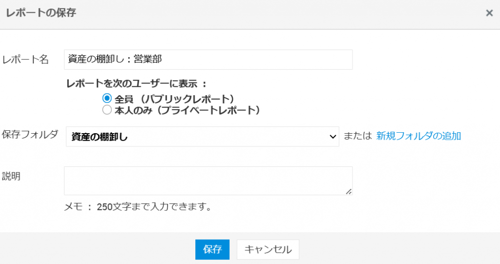 - 表示されたレポート出力ページ上部にある[レポートの保存]をクリックし、必要な項目を入力して保存します。