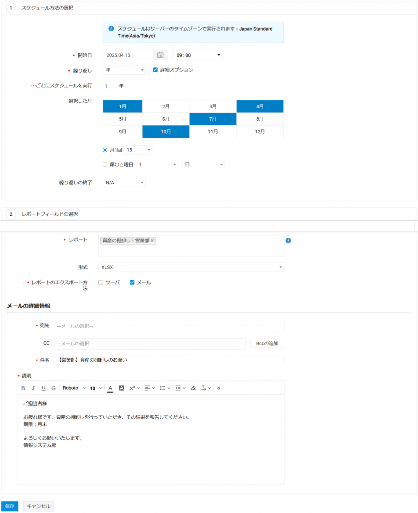 - 「レポートのフィールドの選択」でレポートの「形式」や「レポートのエクスポート方法」を指定し、「宛先」、「件名」、「説明」を入力します。