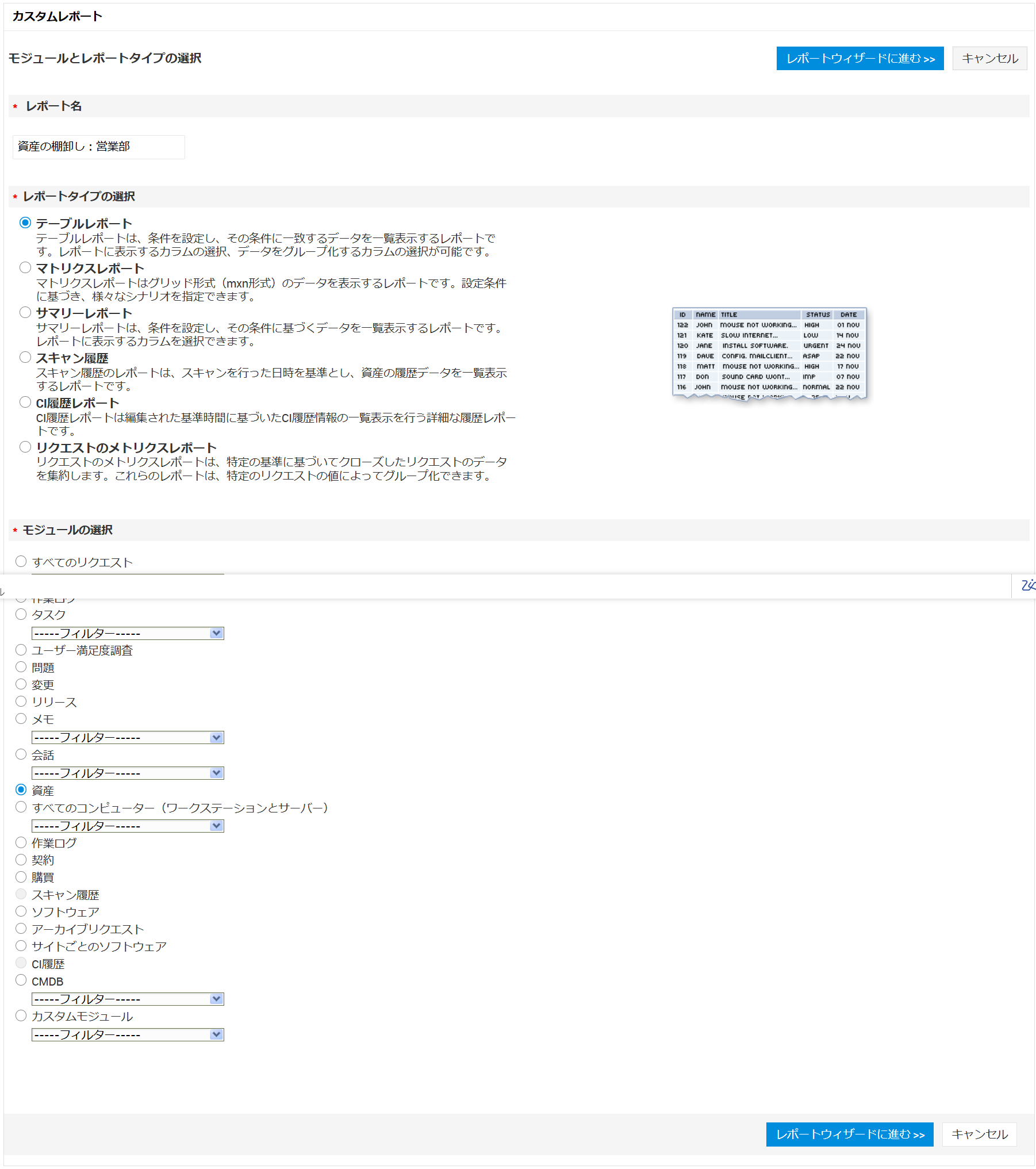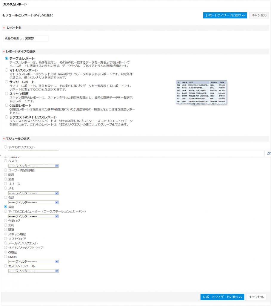 - 「レポート名」を入力し、「レポートタイプの選択」で「テーブルレポート」、「モジュールの選択」で「資産」を選択し、[レポートウィザードに進む>>]をクリックします。