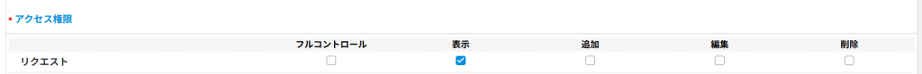 - 「アクセス権限」セクション配下に表示される表にて、「リクエスト」の「表示」にチェックを入れます。必要に応じてその他の権限も付与します。