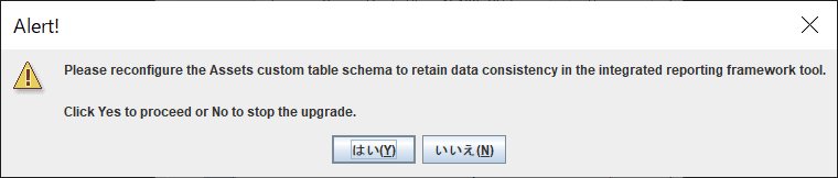 こちらのアラートは、連携しているレポートフレームワークのツールで、データの一貫性を保つために資産のカスタムテーブルスキーマを再構成する必要がある旨を示しています。