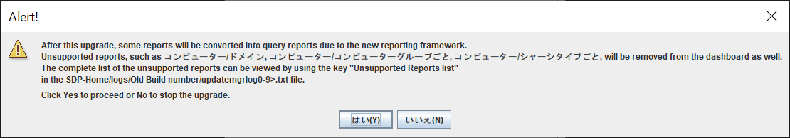 こちらのアラートは、本アップグレードでのレポートフレームワークの更新により、いくつかの既存レポートがクエリレポートに変換される旨を示しています。