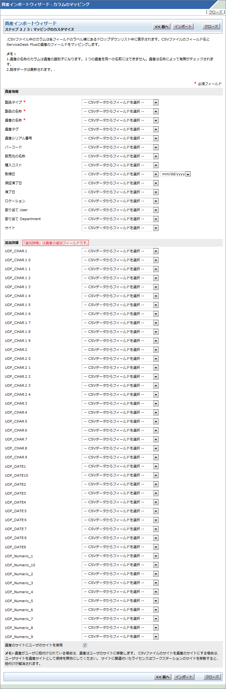 6.「ステップ 2/3:マッピングのカスタマイズ」にて、ServiceDesk Plus上のフィールド名と、CSVファイルのフィールド名をマッピングします。