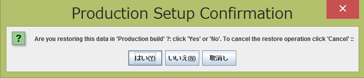 このメッセージは、リストアを行う対象環境が「本番環境」であるのか「検証環境」であるのかを確かめる旨を示しています。