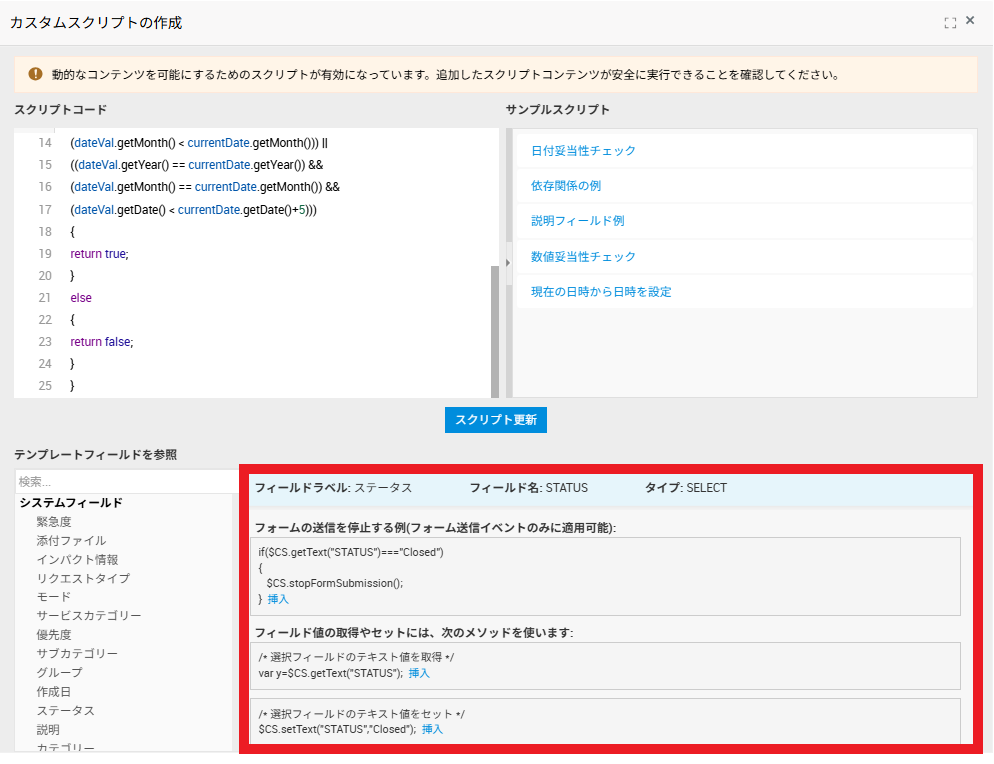 スクリプトの中で使用できるフィールドの参照方法やメソッドについては、スクリ